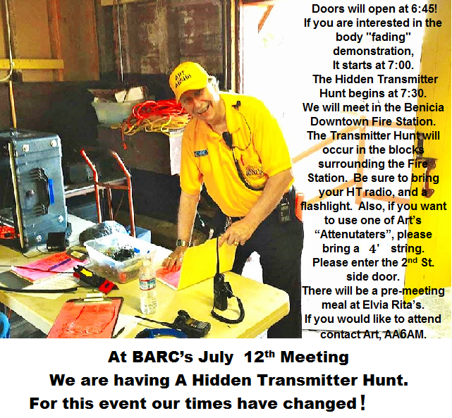 Slight Time change! Hidden Transmitter Hunt at BARC’s July Meeting given By Art Mayoff, AA6AM