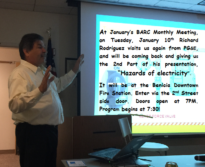 PG&E’s Richard Rodriguez  is coming back to our January BARC Meeting! In November we had the first half of his presentation on “Hazards: Gas”, January’s will be the second part; “Hazards: Electricity”.  The BARC Meeting will be at the BENICIA SENIOR CENTER-187 East L Street, Benicia!! Doors open at 7:00. Meeting begins promptly at 7:30 p.m.